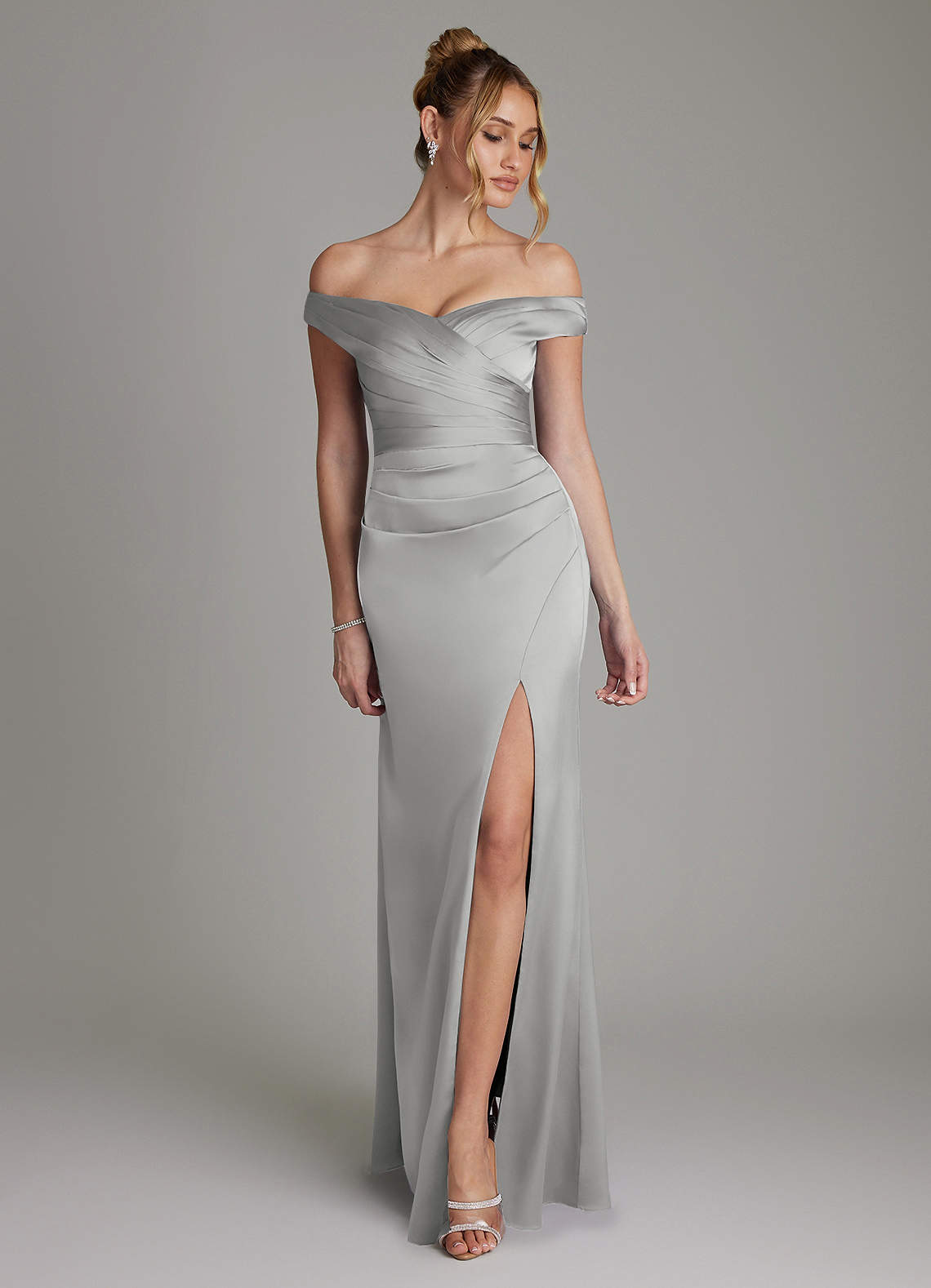 Silver Sheath Off the Shoulder Stretch Satin Dress