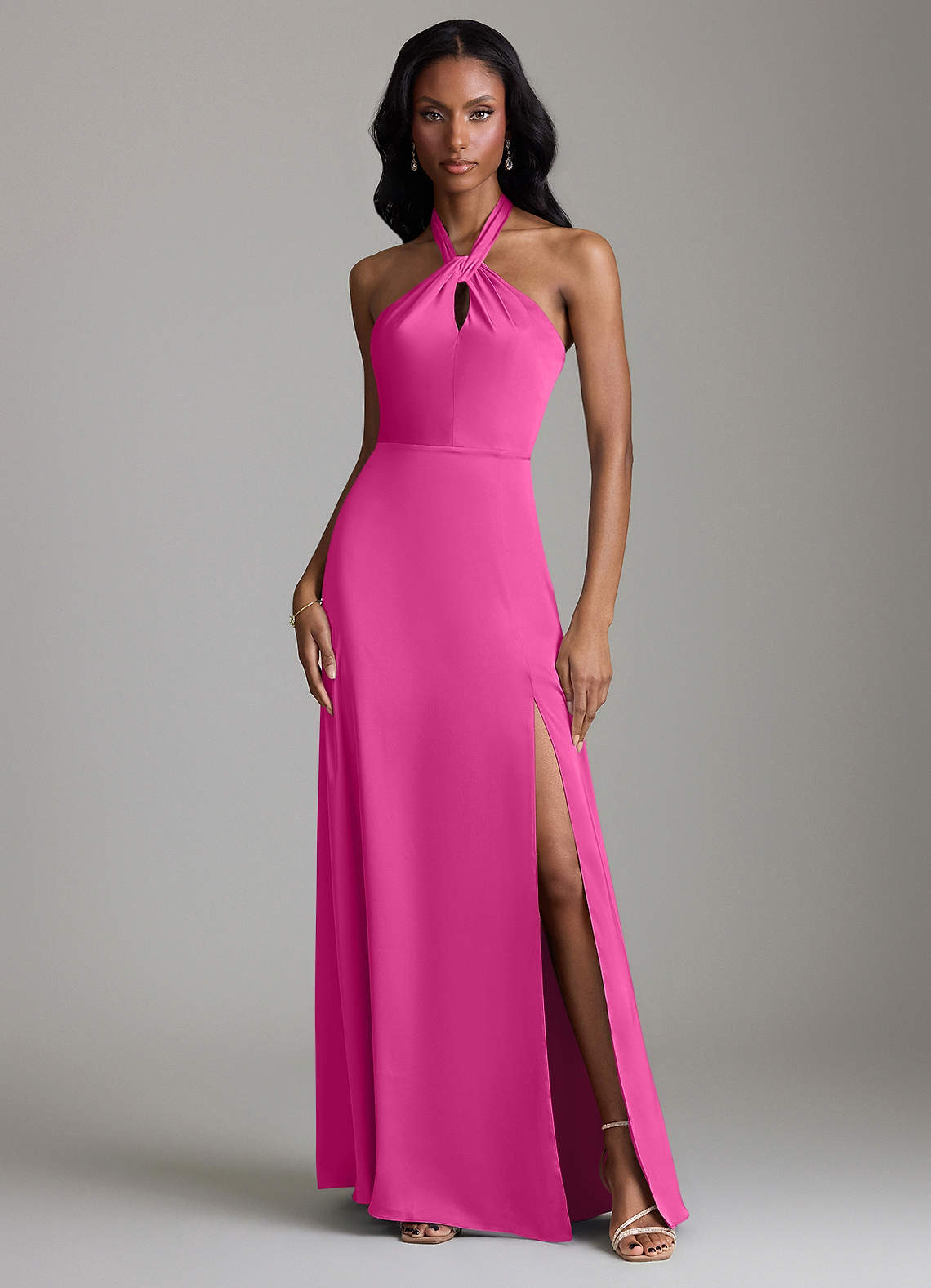 Fuchsia A-Line Side Slit Stretch Satin Dress