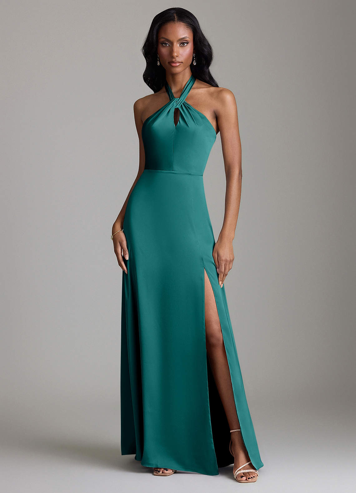Peacock A-Line Side Slit Stretch Satin Dress
