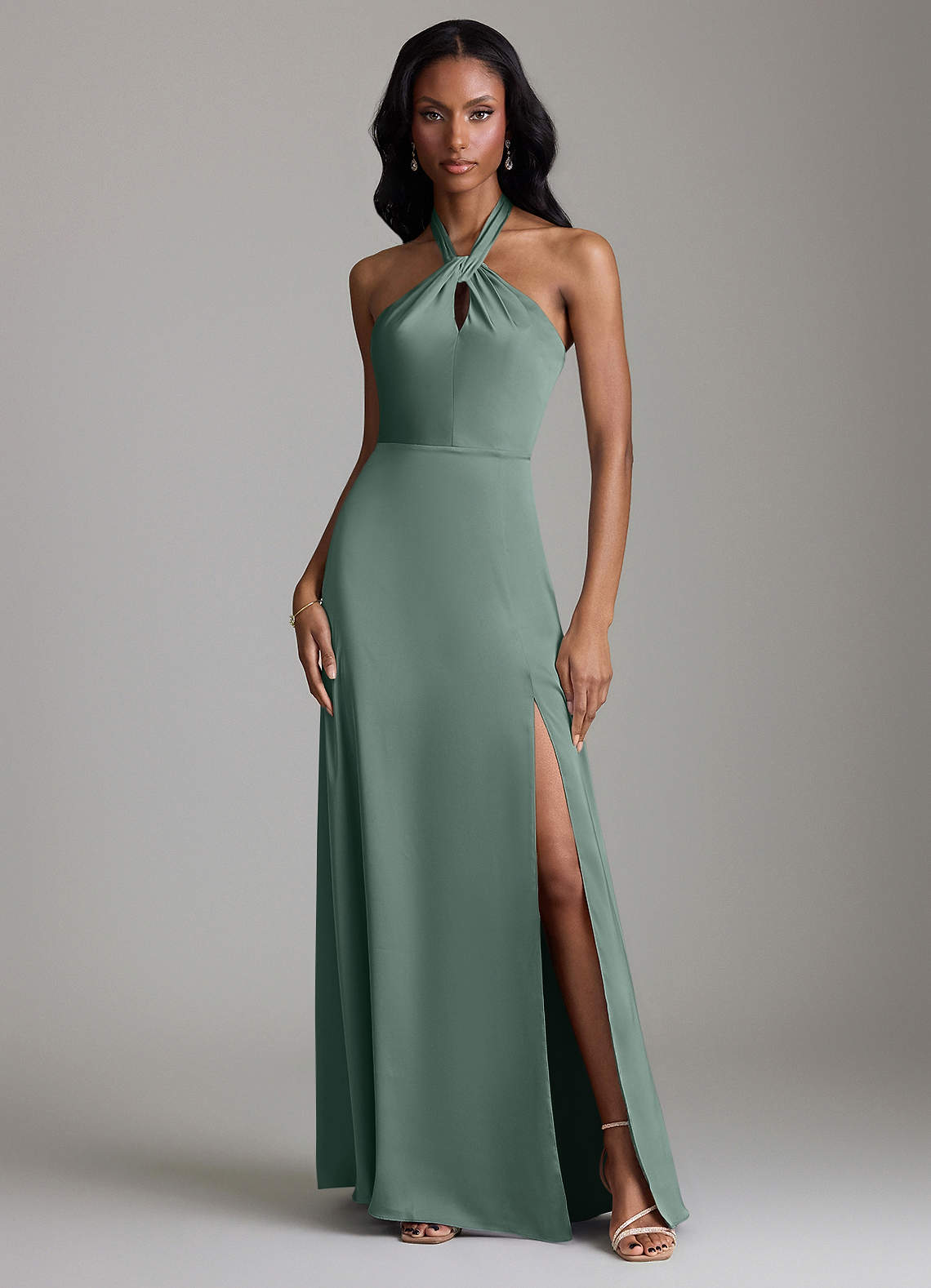 Sea Moss A-Line Side Slit Stretch Satin Dress