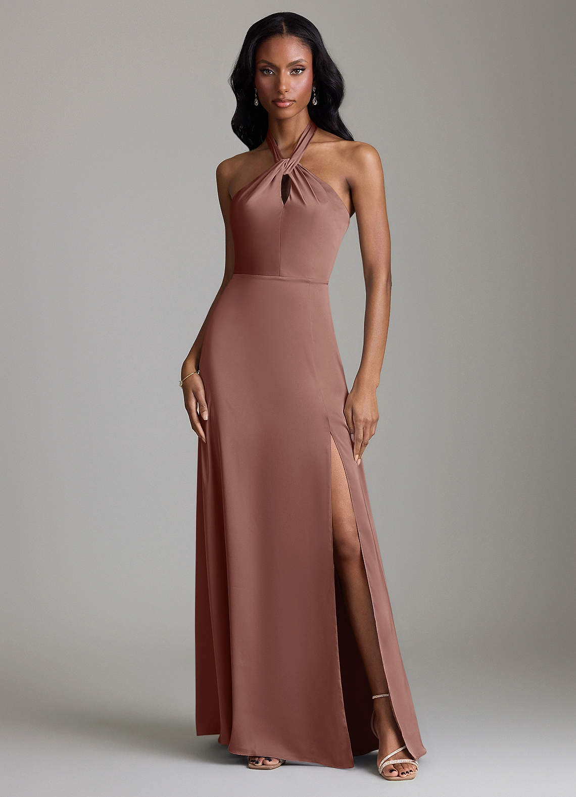 Espresso A-Line Side Slit Stretch Satin Dress