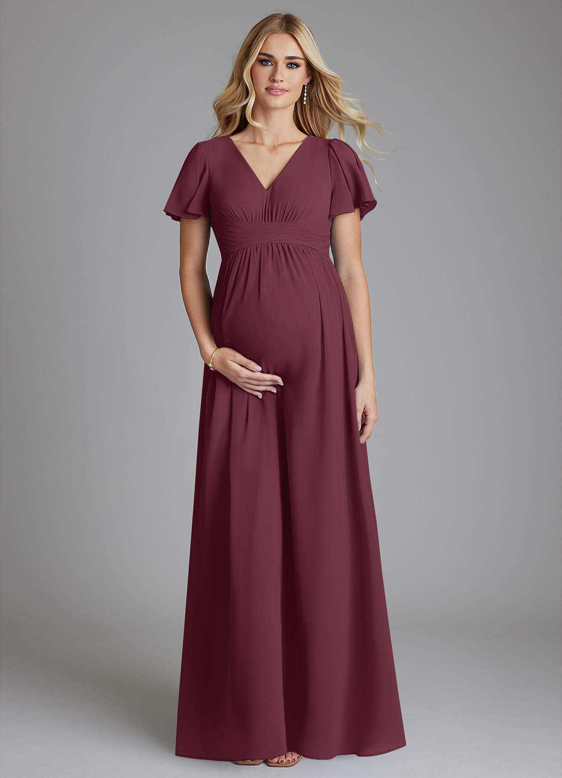 A-Line V-Neck Ruched Chiffon Floor-Length Dress Cabernet