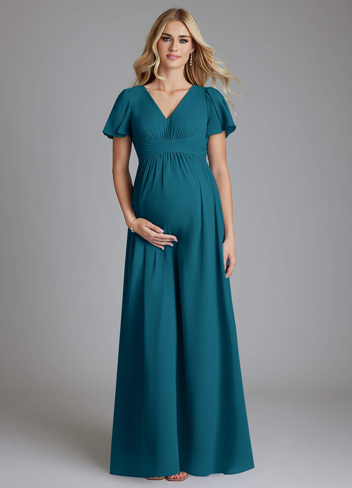 A-Line V-Neck Ruched Chiffon Floor-Length Dress Ink Blue