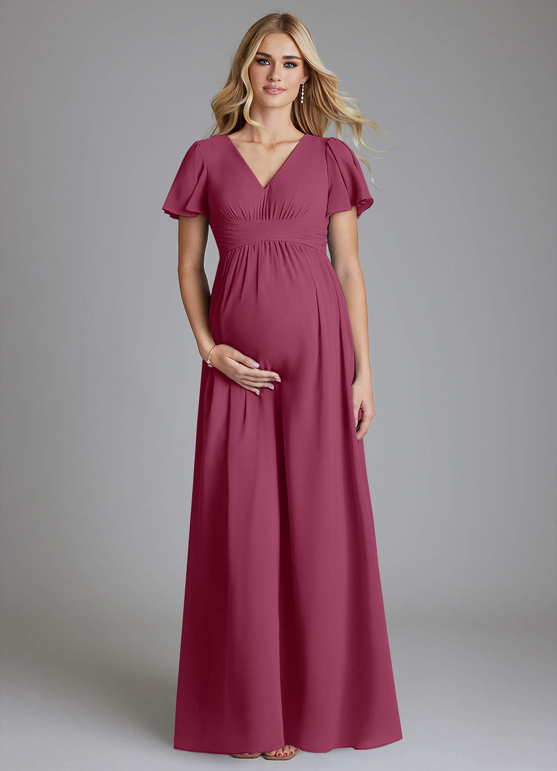 A-Line V-Neck Ruched Chiffon Floor-Length Dress Mulberry