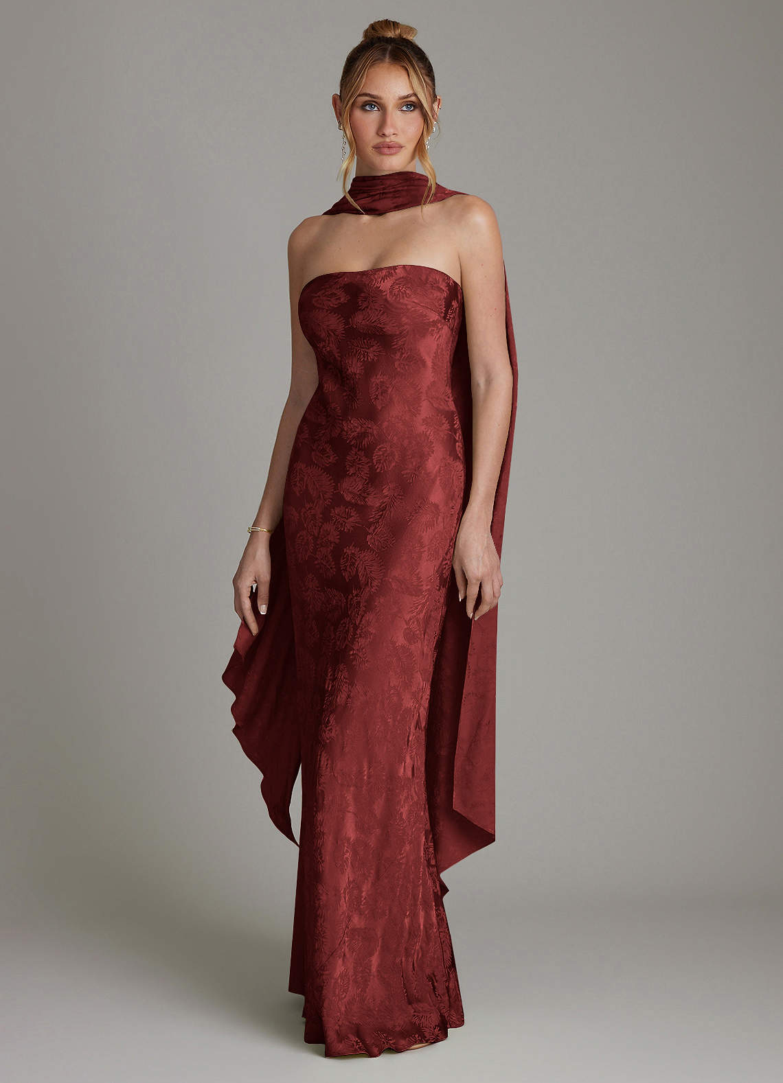 Rust Jacquard Sheath Strapless Jacquard Dress