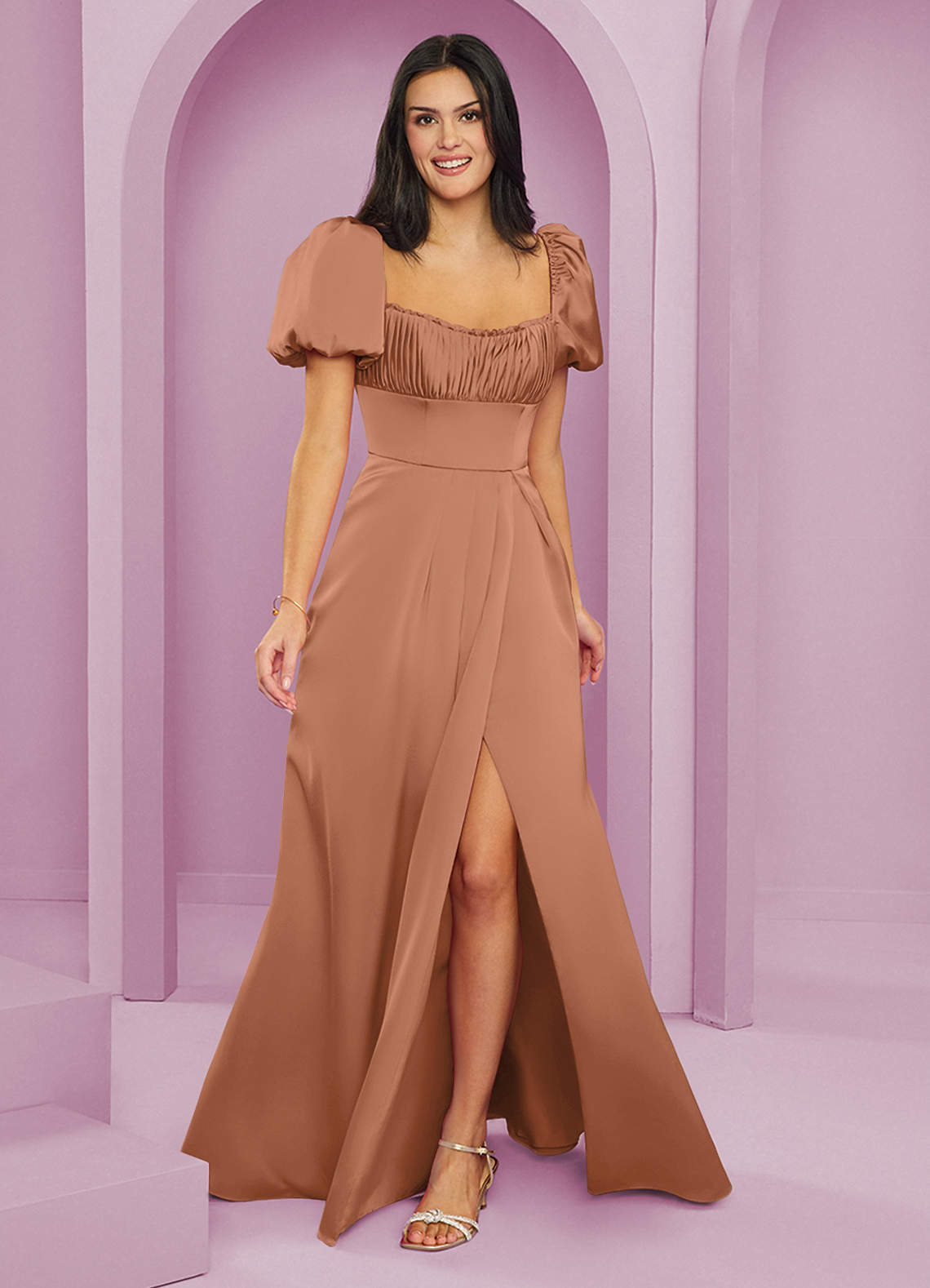 Bronzer A-Line Ruched Stretch Satin Dress Bronzer