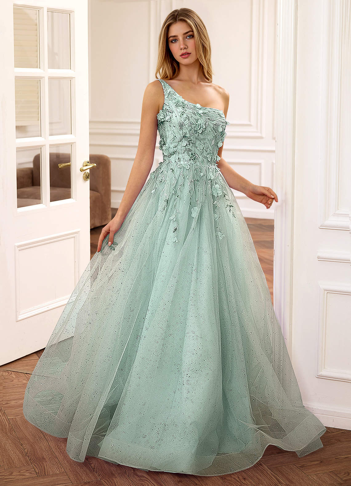 Felicite Light Green Floral A-line Tulle Sequin One Shoulder Glitter Prom Dress
