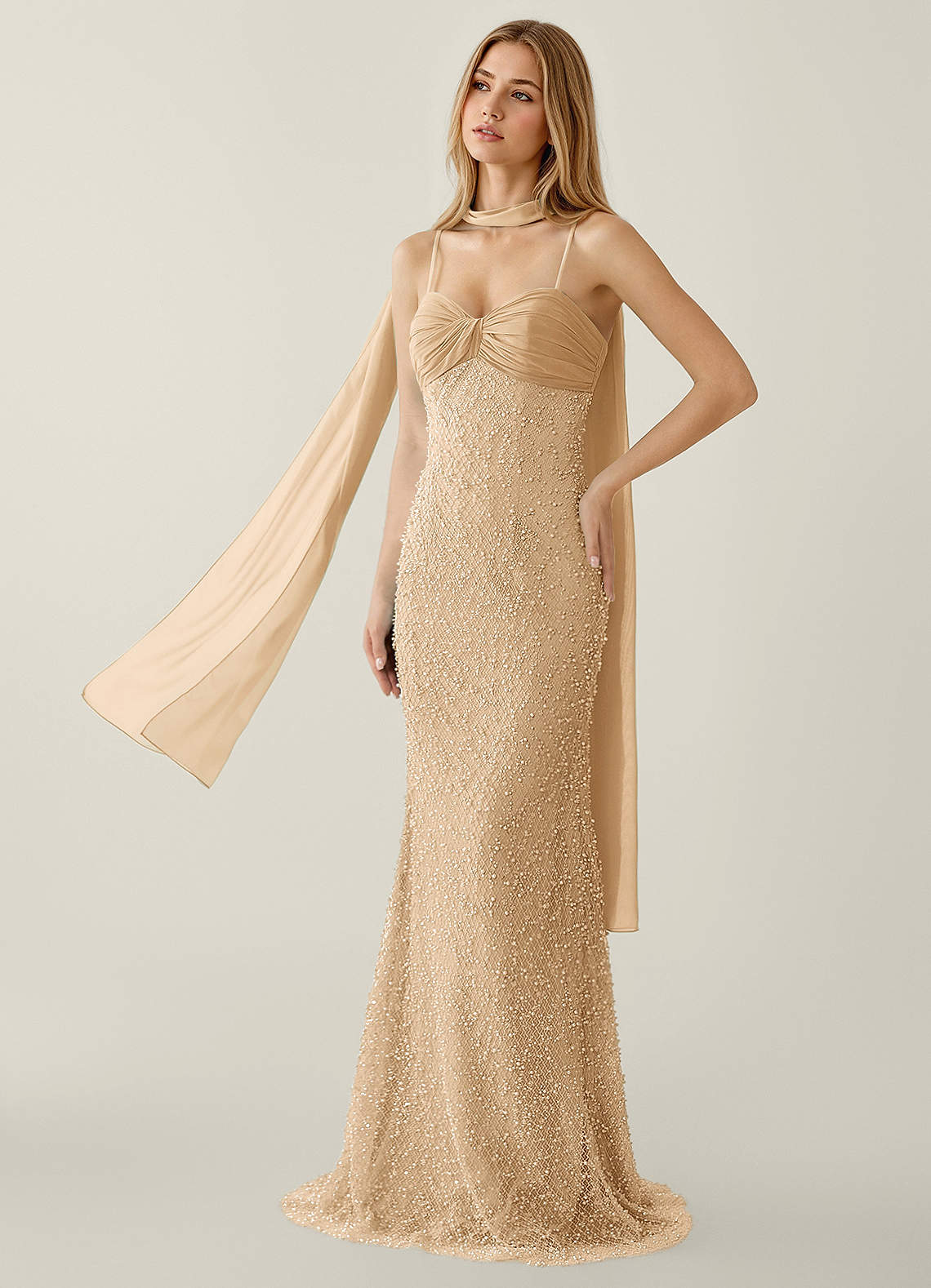 Jasminiah Champagne Pearl-Embellished Lace/Chiffon Prom Dress