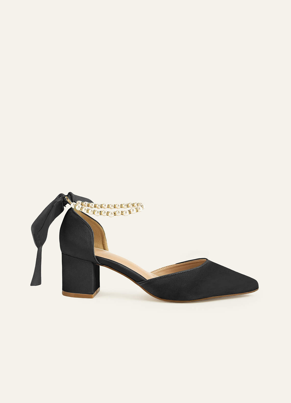 Matching Color Matte Satin Pearl and Bow Pointed Toe Block Heels