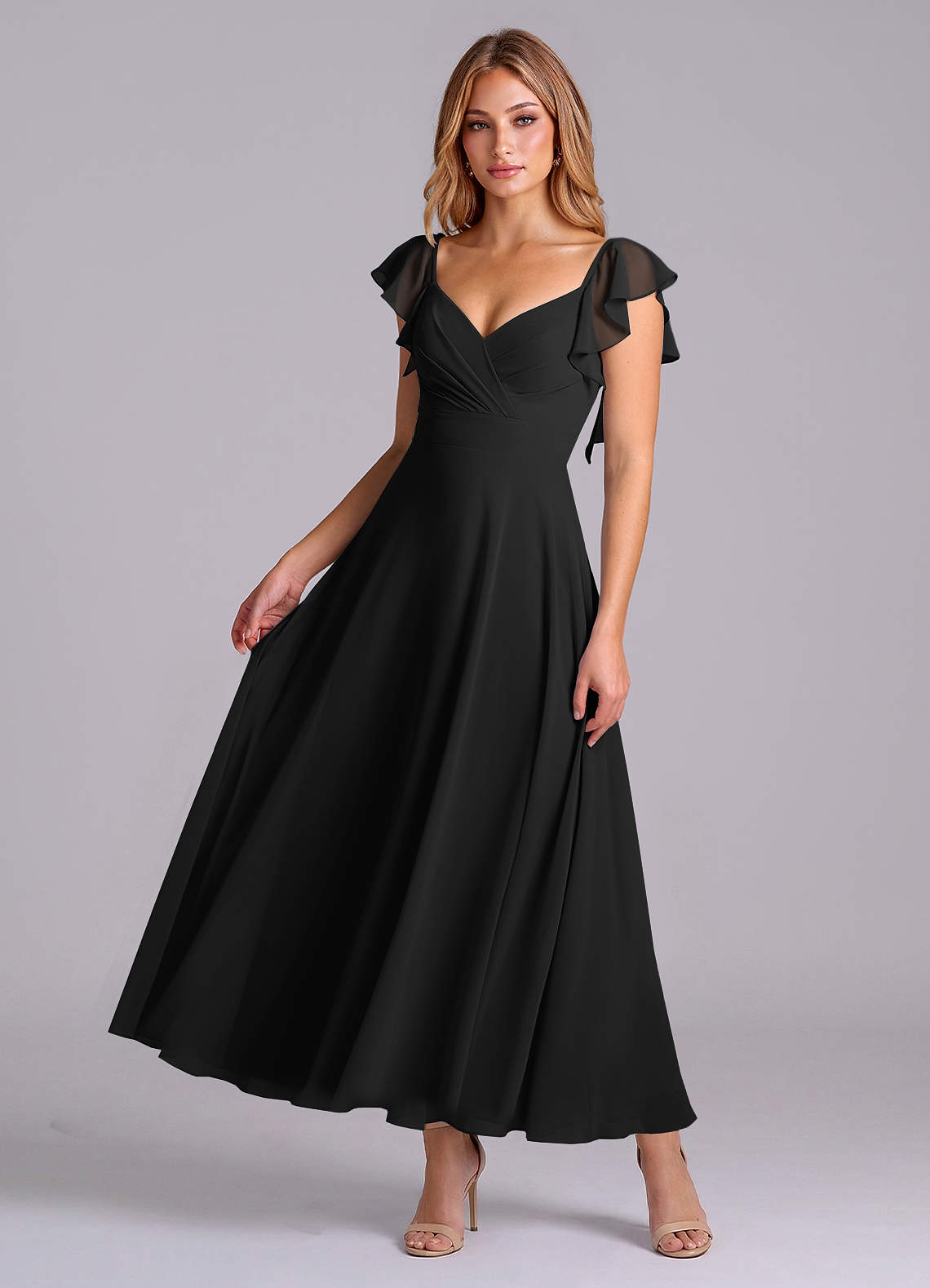 Black A-Line Ruched Chiffon Dress