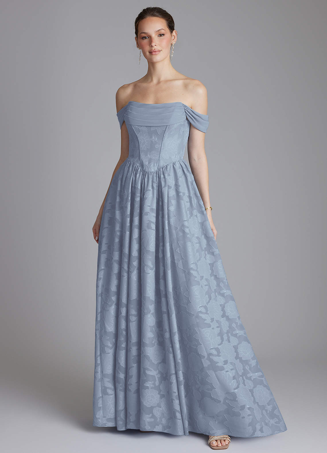 Dusty Blue A-Line Off the Shoulder Floral Burnout Dress