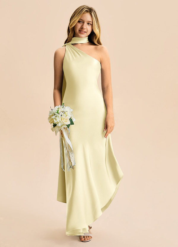 Vestido Sorvete De Limão de Cetim elástico de Linha A com Fora do ombro