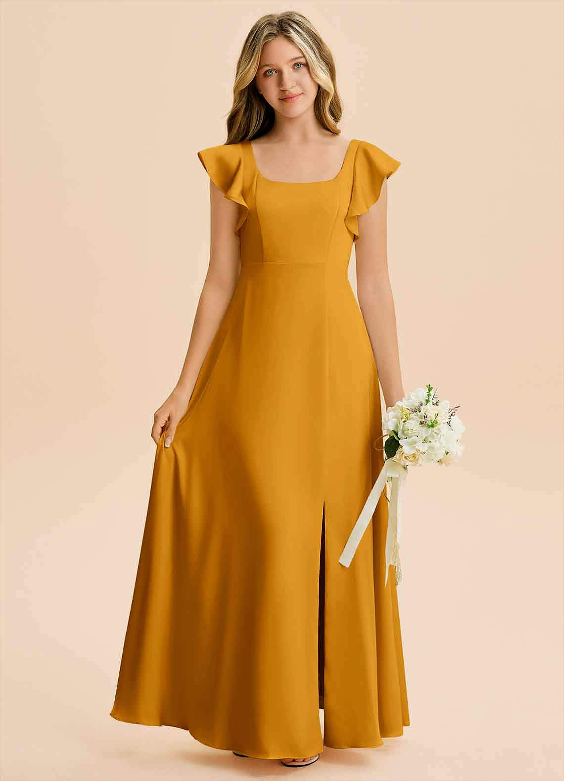 Vestido Caramelo de Cetim elástico de Linha A com Fenda Lateral