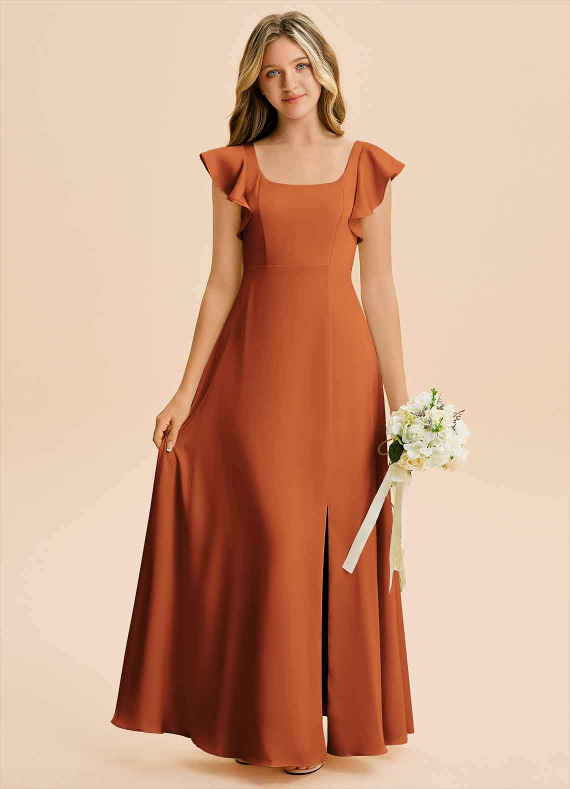 Vestido Canela de Cetim elástico de Linha A com Fenda Lateral