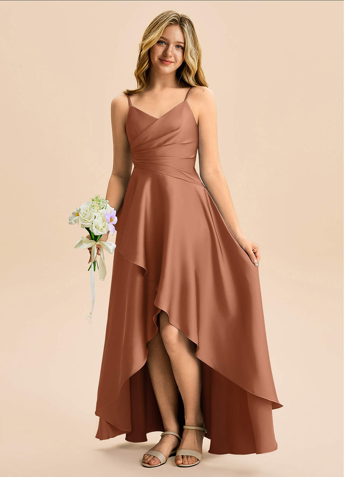 Vestido Bronzeador de Cetim elástico de Linha A com Plissado