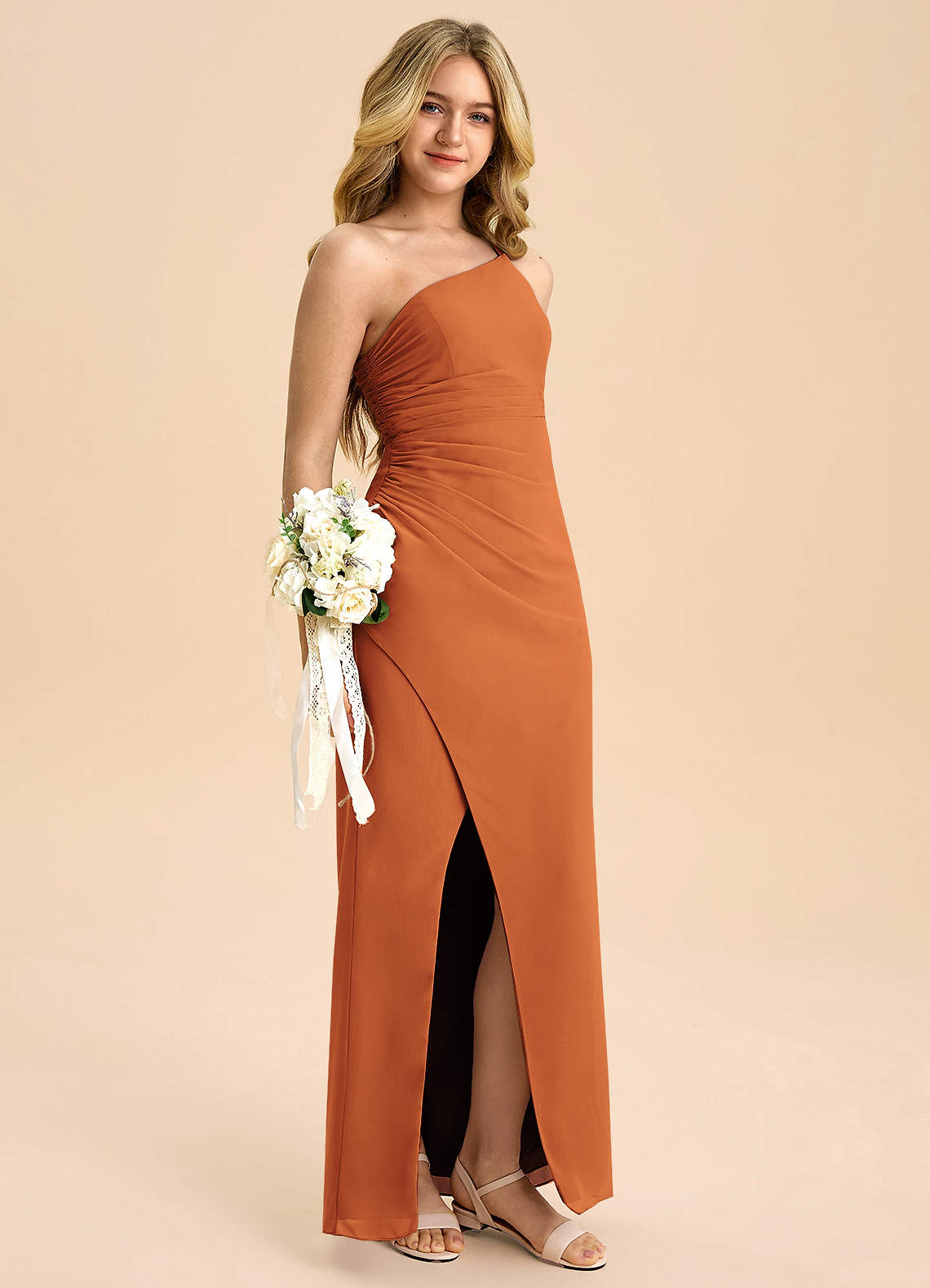Vestido Canela de Chiffon de Linha A com Plissado