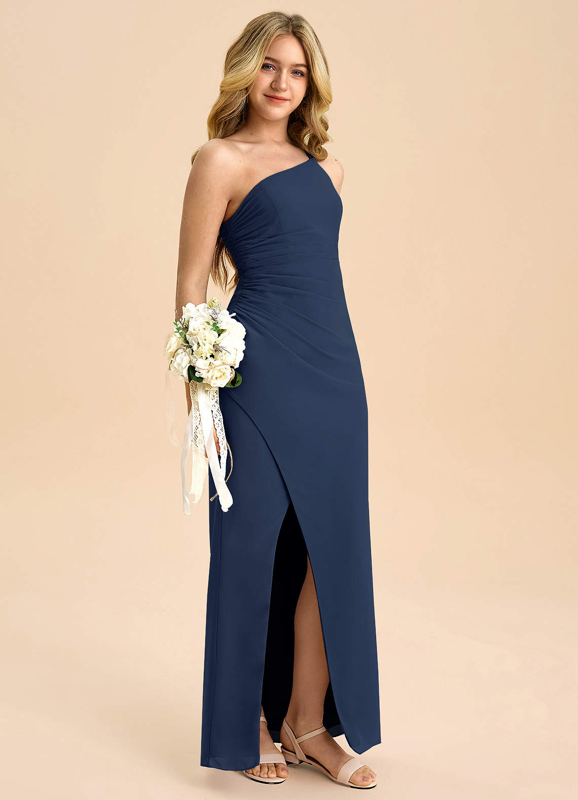 Vestido Azul Marinho de Chiffon de Linha A com Plissado