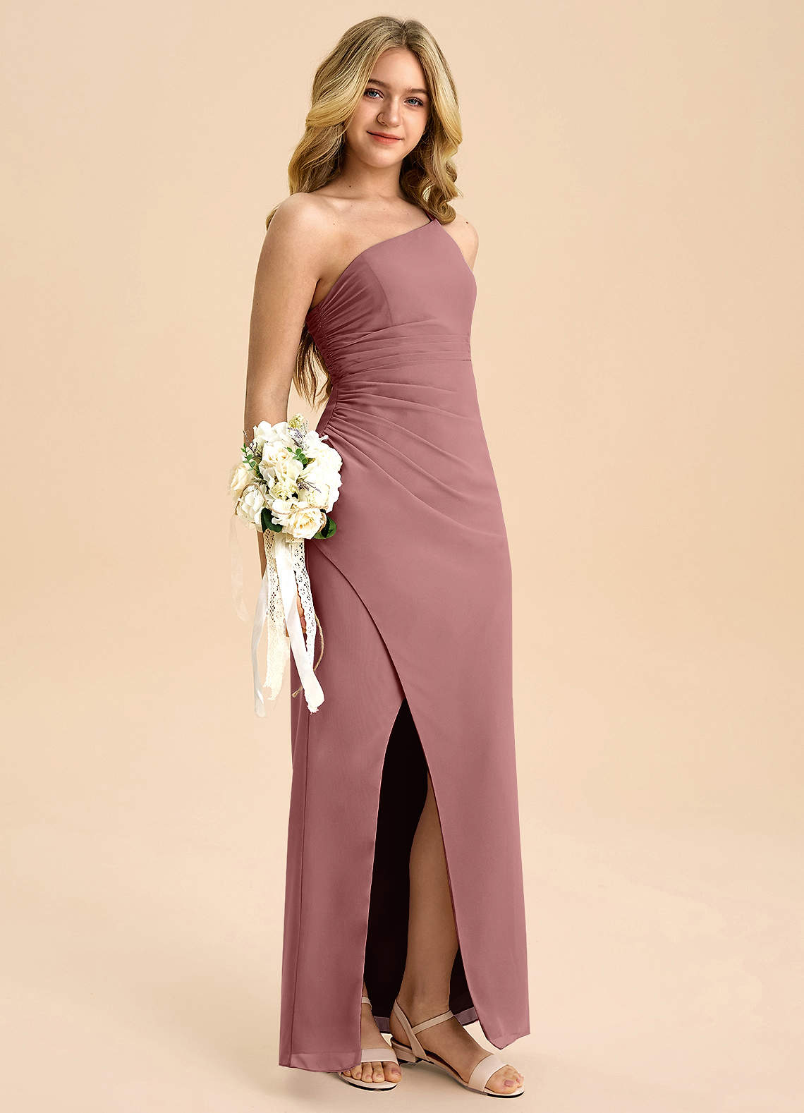 Vestido Rosa Do Deserto de Chiffon de Linha A com Plissado