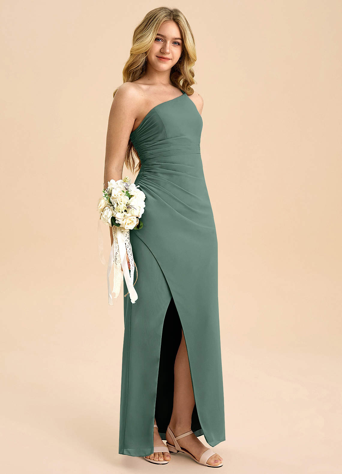 Vestido Musgo Marinho de Chiffon de Linha A com Plissado