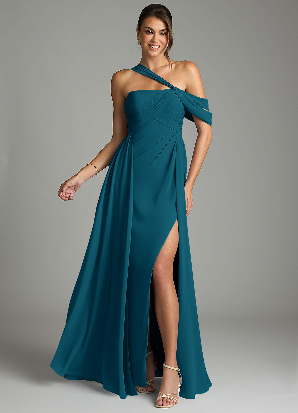 Vestido Tinta Azul de Chiffon de Linha A com Fora do ombro