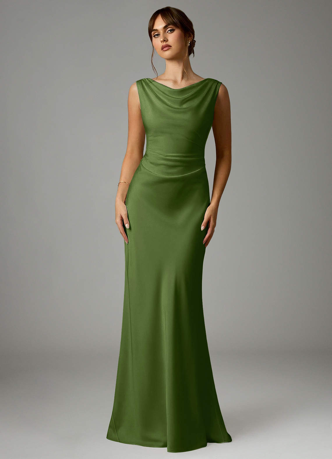 Vestido Zimbro de Cetim elástico de sereia com Plissado