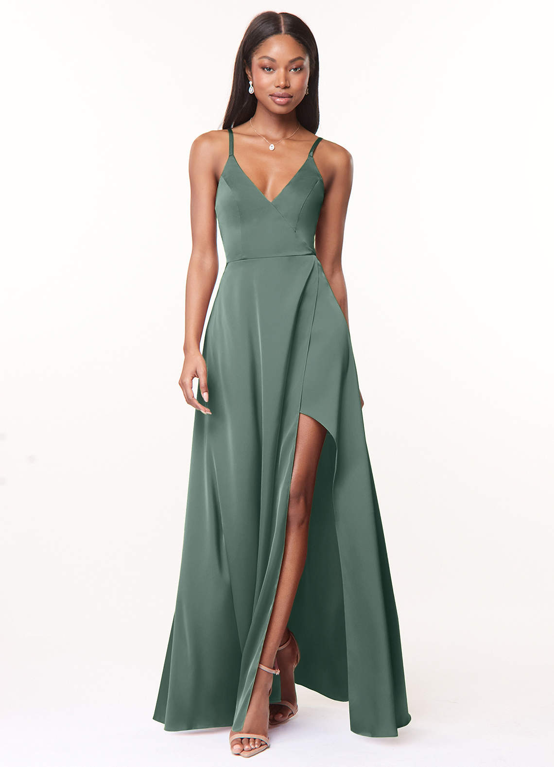 Vestido Musgo Marinho de Cetim elástico de Linha A
