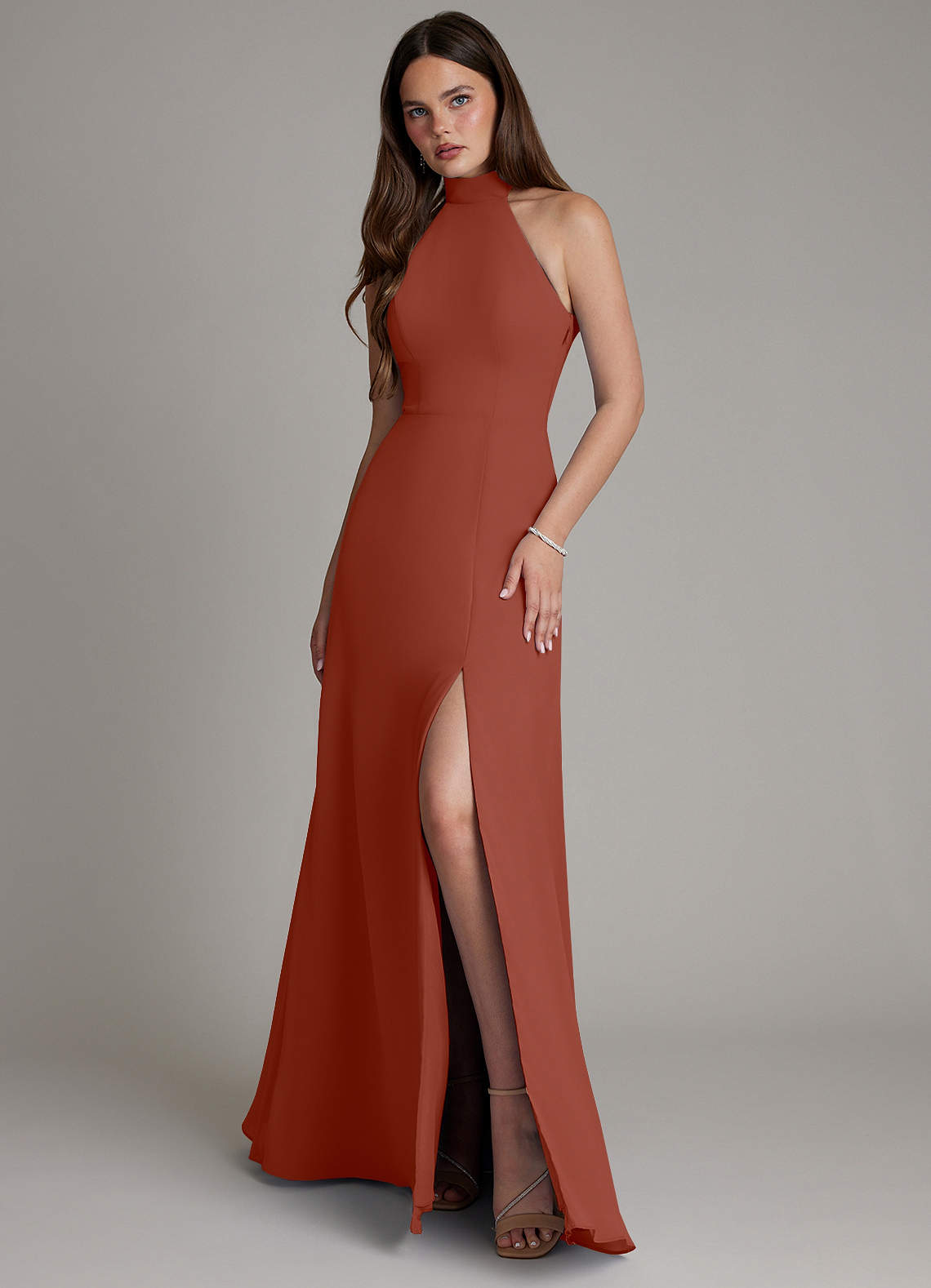 Vestido Castanho Aloirado de Chiffon de Linha A com Pescoço alto