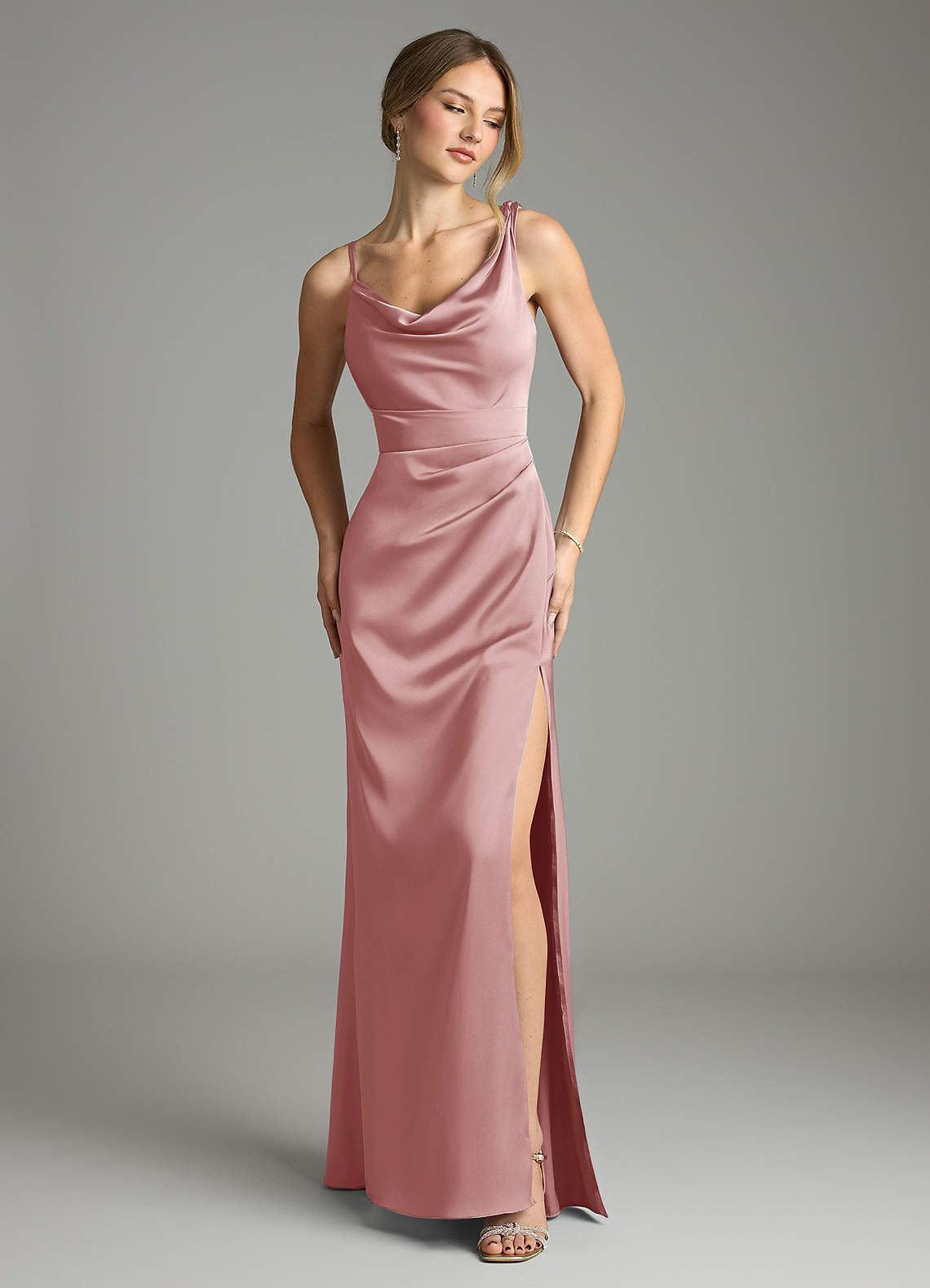 Vestido Rosa Empoeirada de Cetim elástico de sereia com Plissado