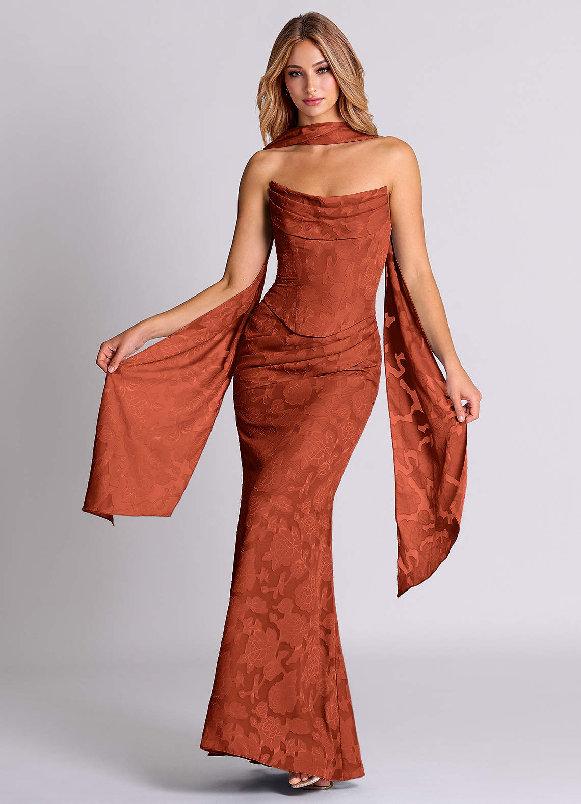 Vestido Castanho Aloirado de Esgotamento Floral de sereia com Espartilho