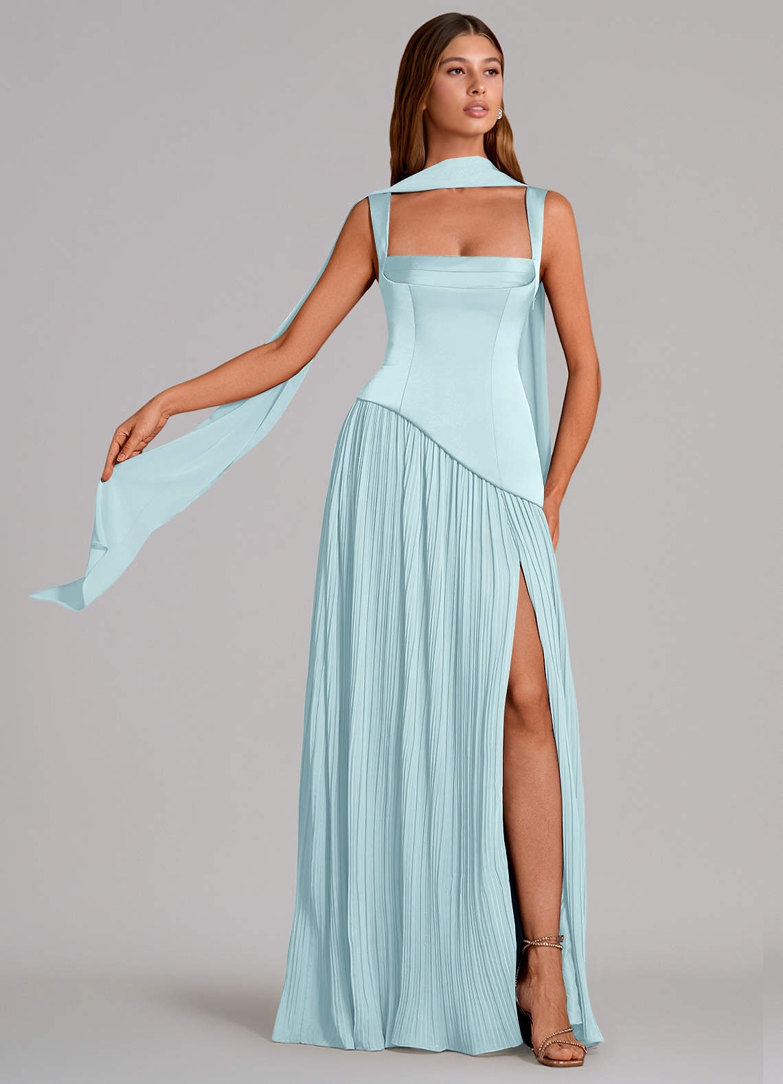 Vestido Nuvem Azul de Cetim elástico de Linha A com Plissado