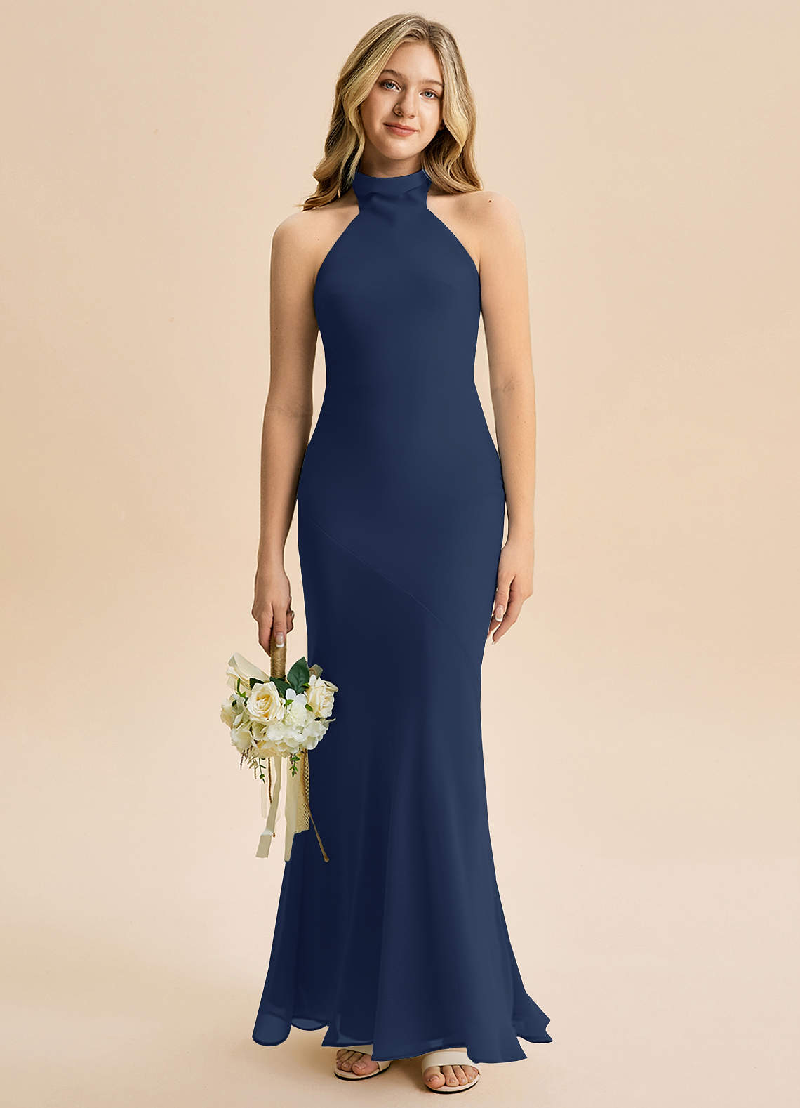 Vestido Azul Marinho de Chiffon de sereia com Pescoço alto