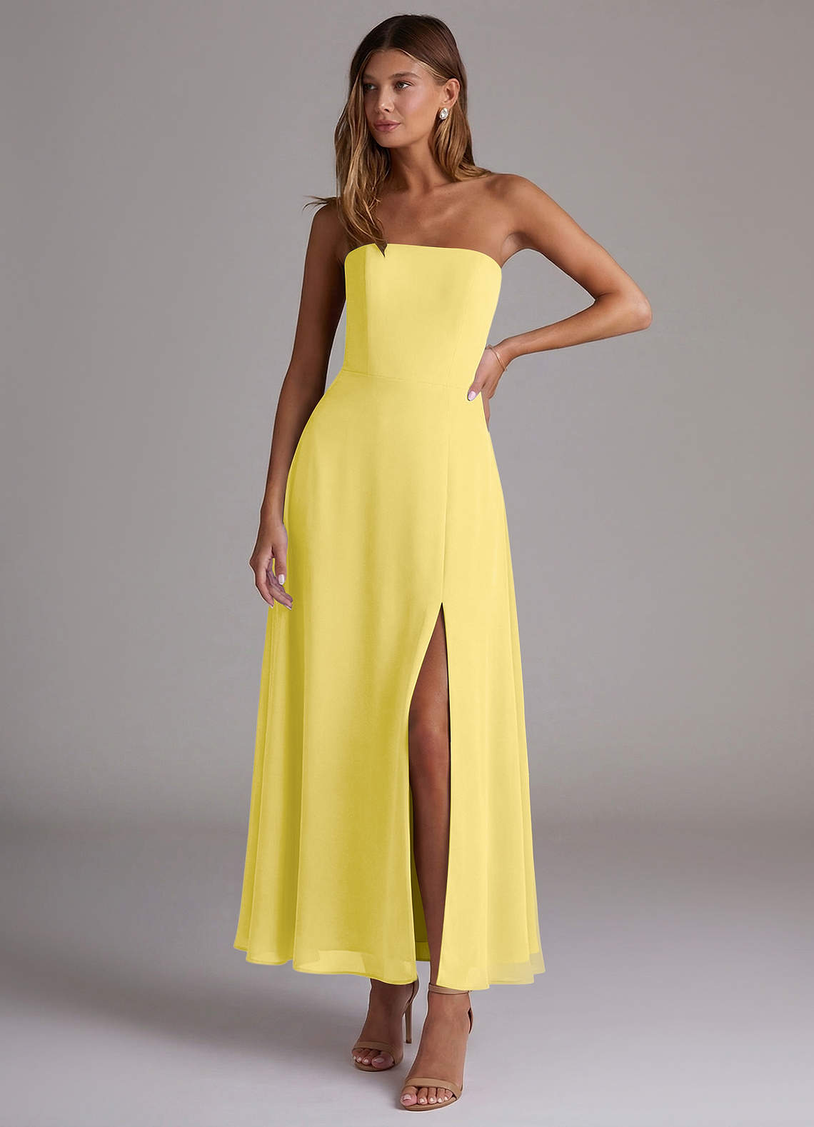 Vestido Canário de Chiffon de Linha A com Sem alças