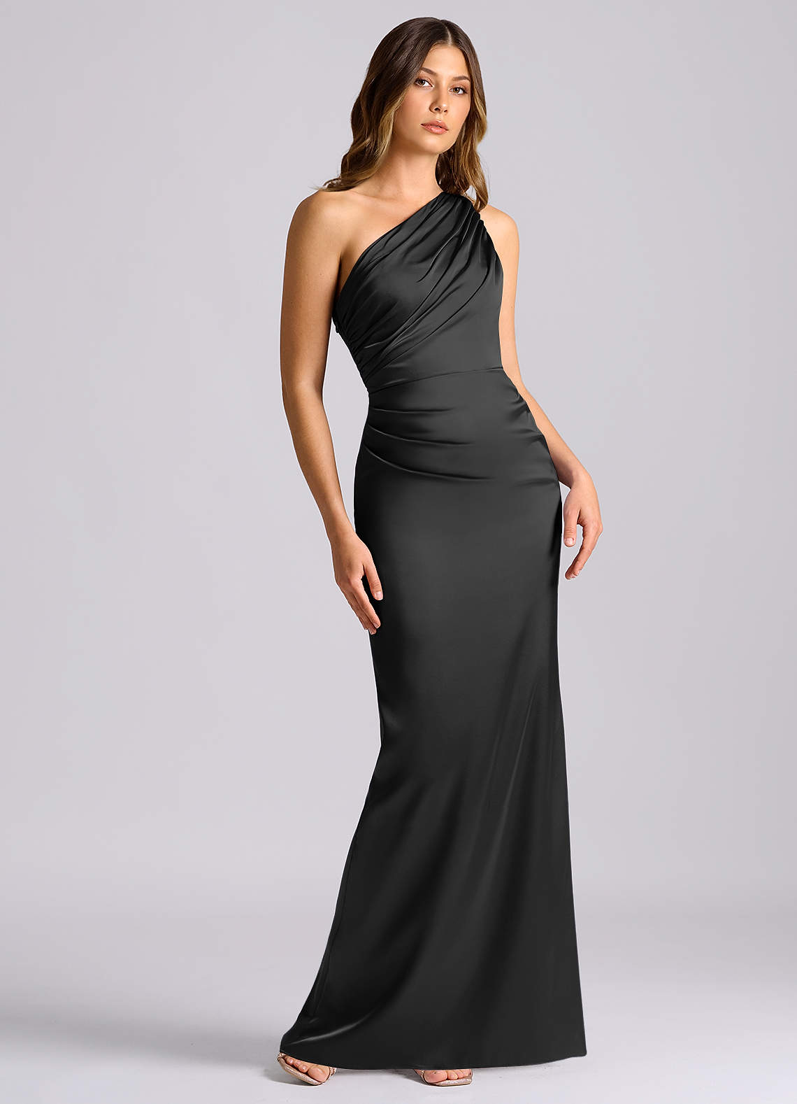Klä av Sjöjungfru i Stretch Satin Ena axeln Svart