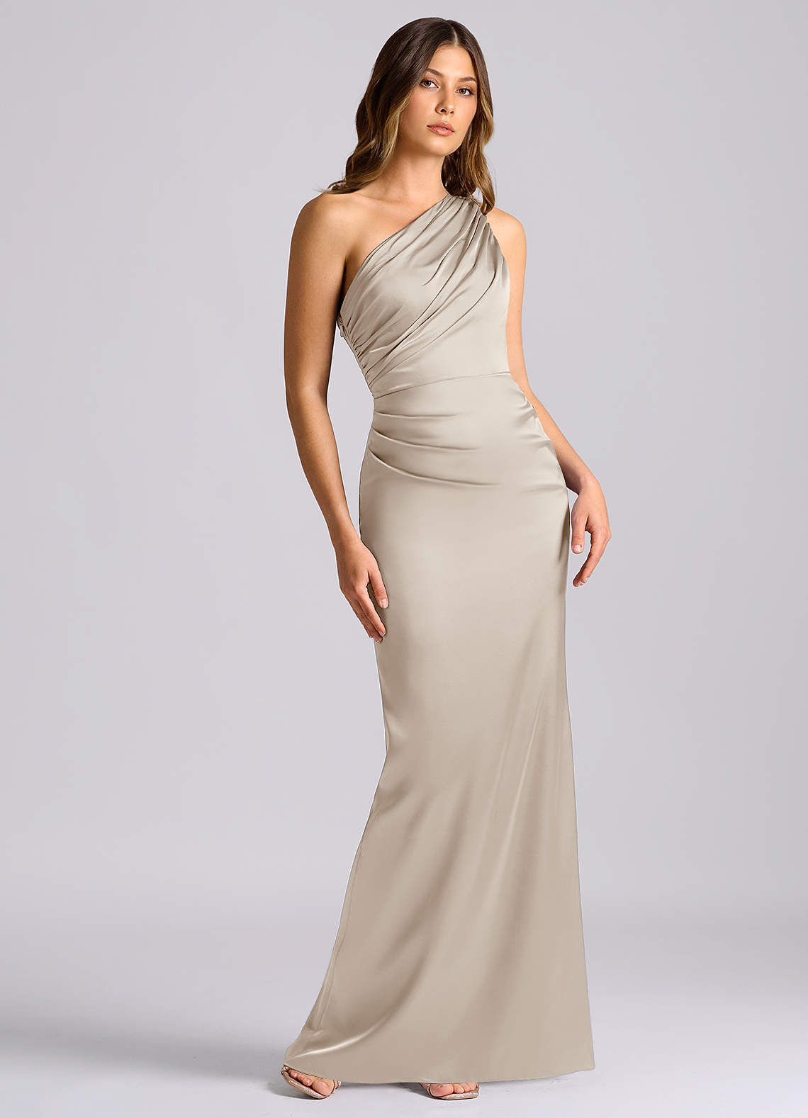 Klä av Sjöjungfru i Stretch Satin Ena axeln Frost