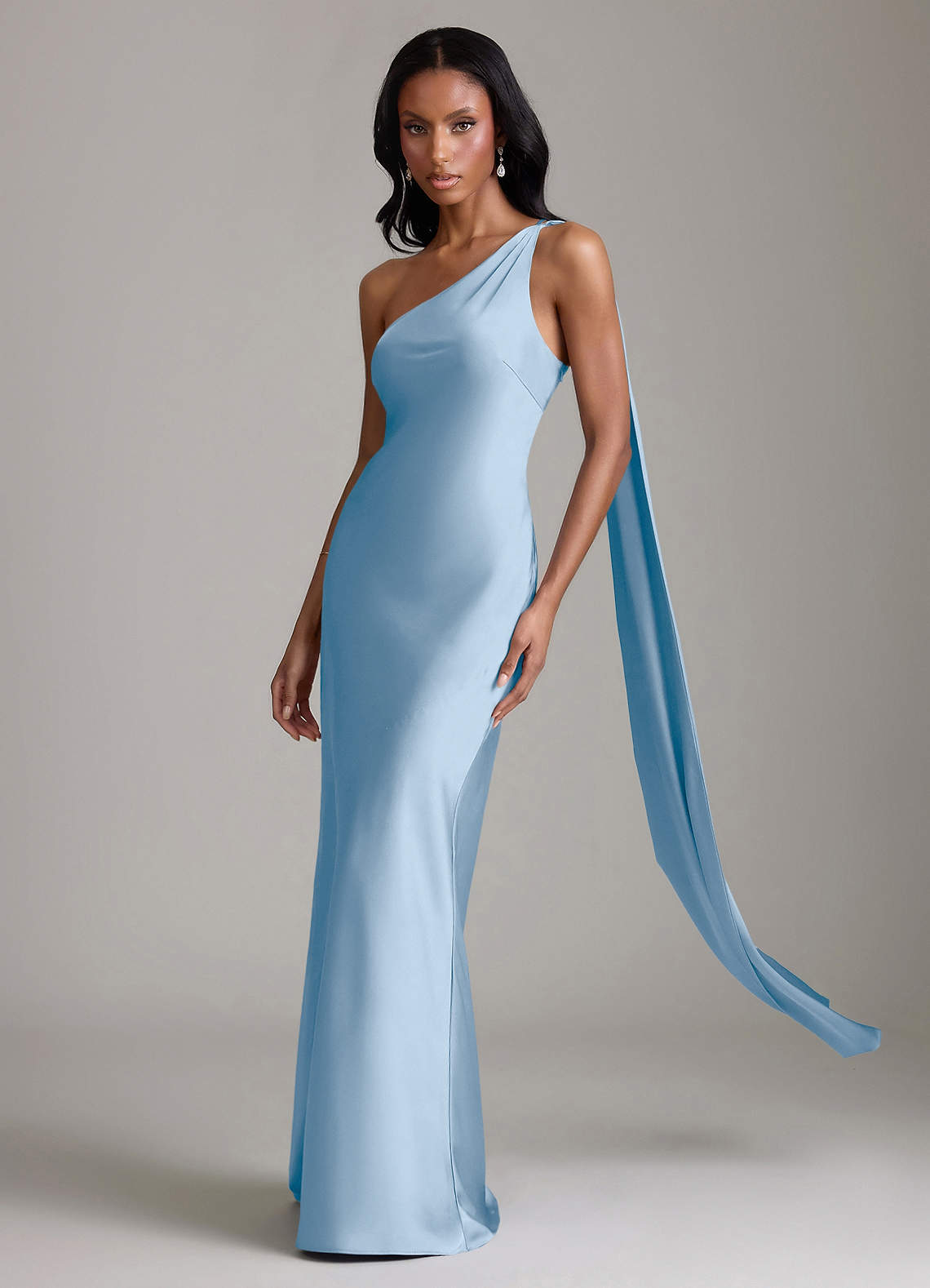 Klä av Sjöjungfru i Stretch Satin Ena axeln Puderblå