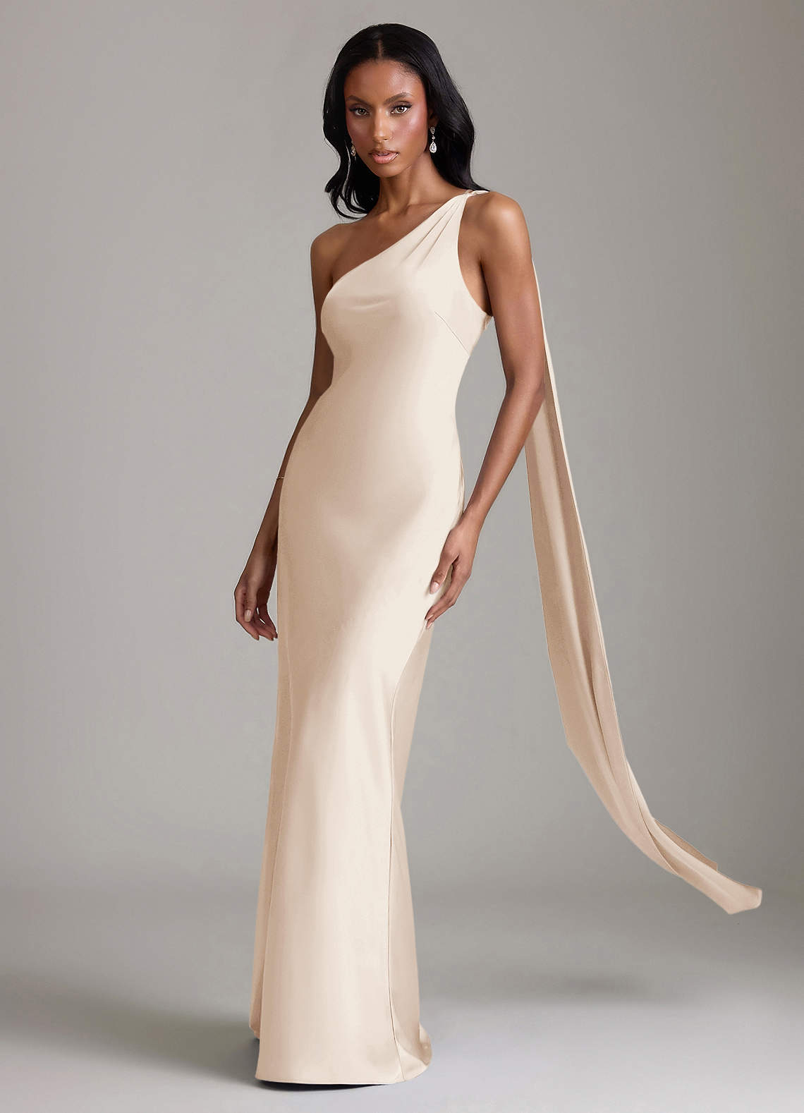 Klä av Sjöjungfru i Stretch Satin Ena axeln Vit Alabaster