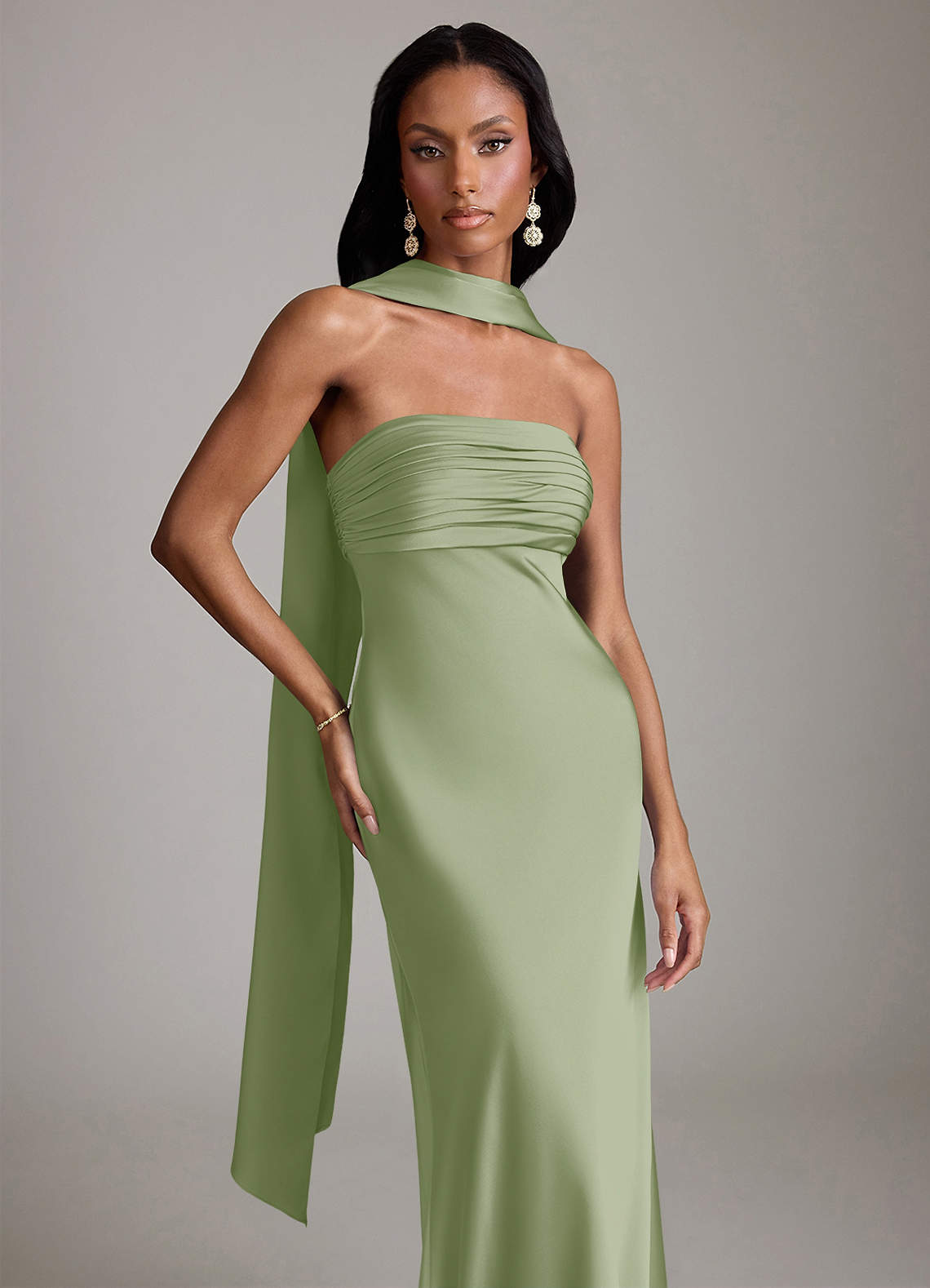 Klä av Sjöjungfru i Stretch Satin Axelbandslös Dusty Sage