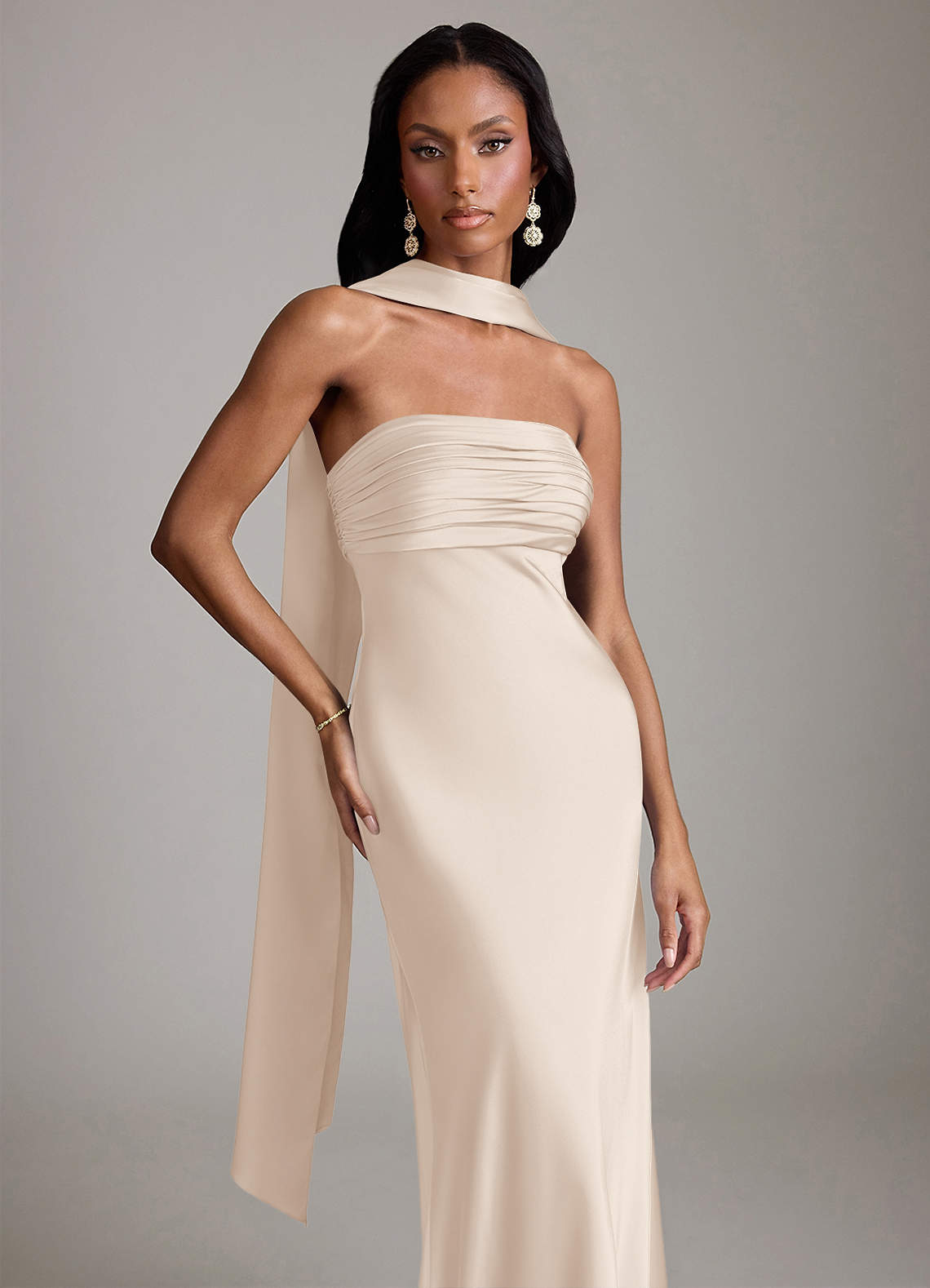 Klä av Sjöjungfru i Stretch Satin Axelbandslös Vit Alabaster