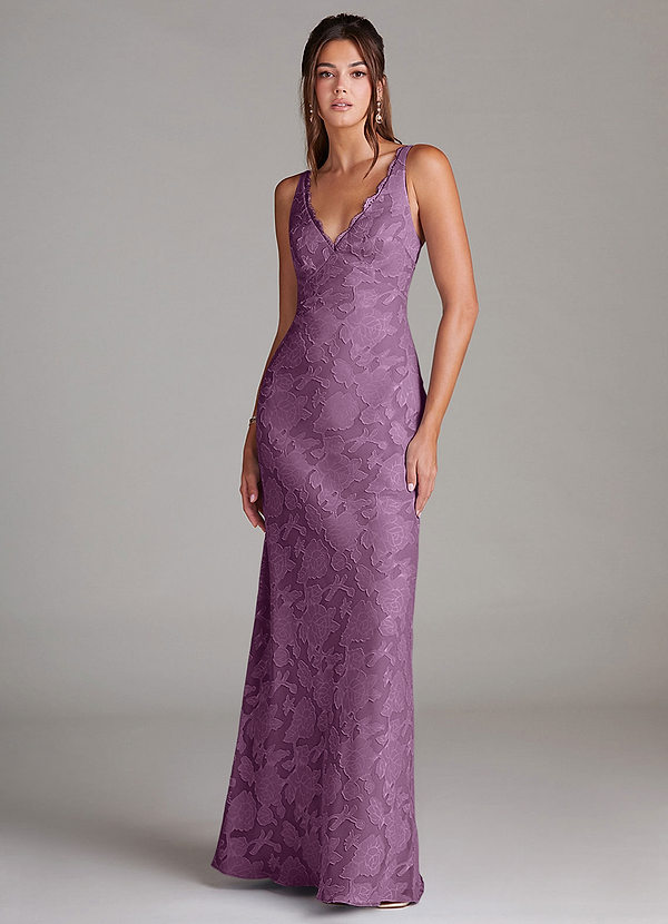 I wanted my garden wedding palette to exude a romantic feel, so all the colors were very soft and pale. Since my favorite color is purple, we decided on Wisteria for the bridesmaid dresses. Also, I think purple is just the right amount of romance without being overly so like pink or red. We chose this floor-length dress with a mermaid-style skirt.